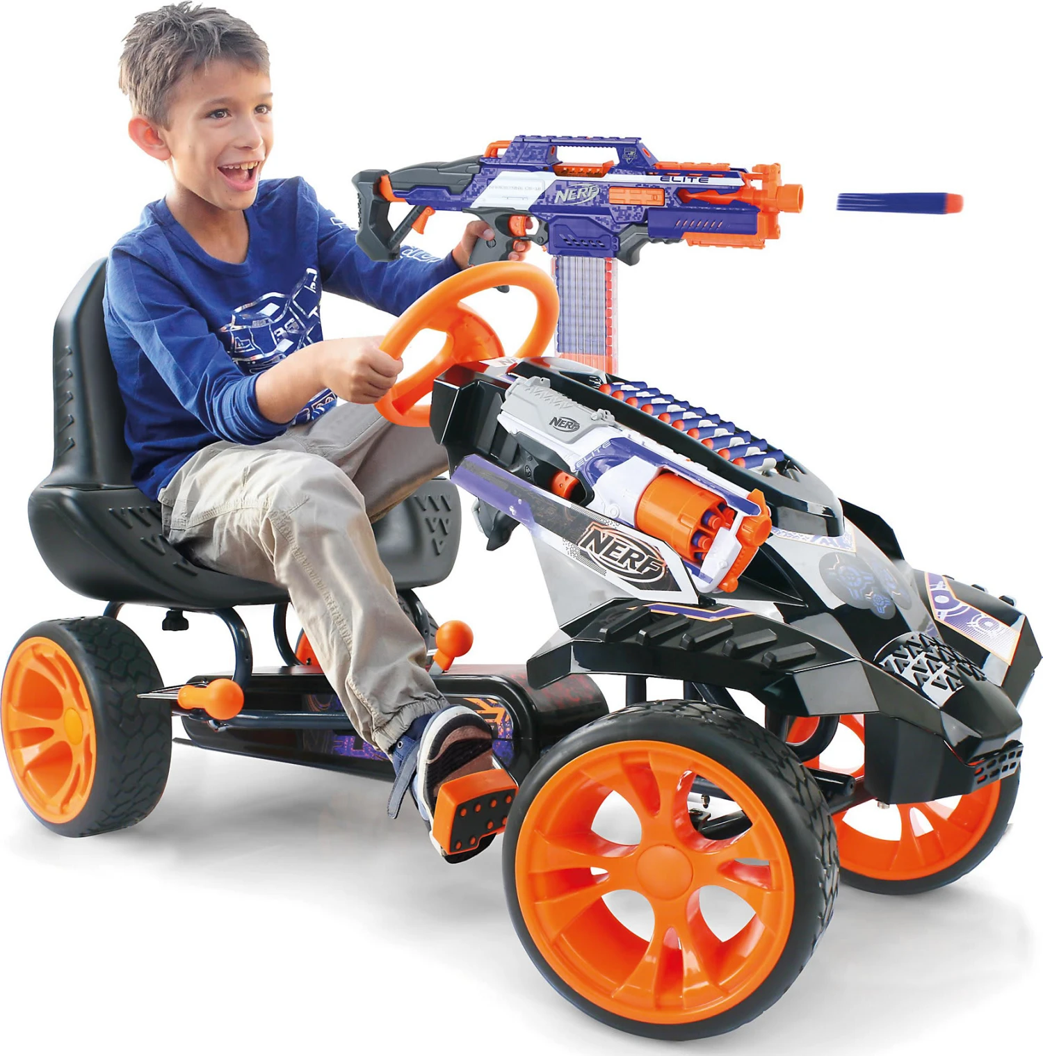 Dieses coole Gefährt ist ein Go-Kart Nerf Battle Racer aus dem Hause hauck Toys und sorgt für jede Menge Action! Neben seinem tollen Aussehen punktet das Go-Kart auch mit vielen Funktionen. So gibt es eine Handbremse für beide Hinterräder, eine automatische Freilaufschaltung sowie eine dreifach verstellbare Sitzposition. Das Fahrzeug mit 10″ kugelgelagerten EVA-Rädern lässt sich leicht bedienen und verfügt zudem über eine gute Bodenfreiheit und genügend Grip auch im unebenen Gelände. Die eingebauten Fächer und Clips bieten Platz für zehn NERF Darts und zwei NERF Blaster.